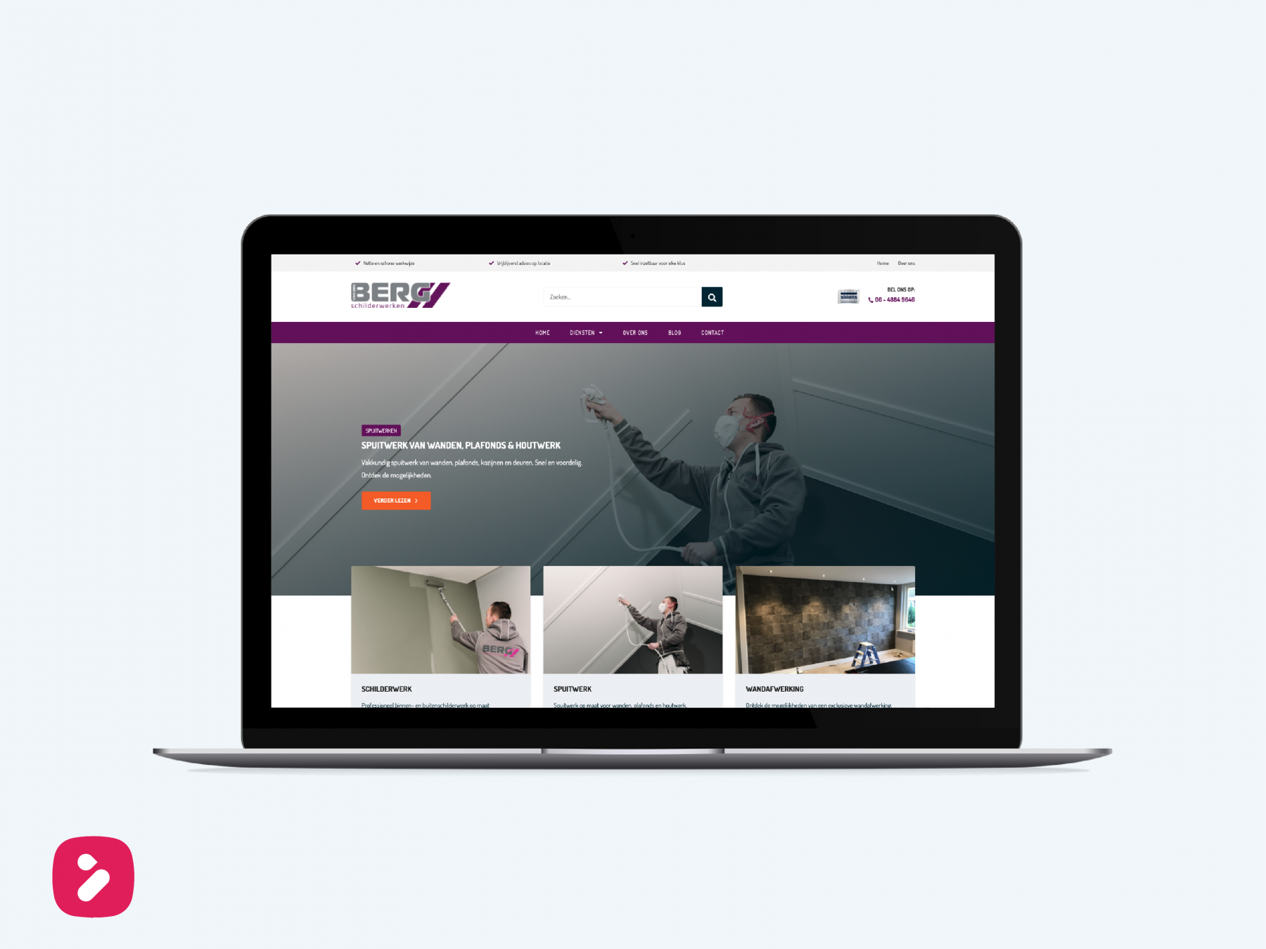 Heb jullie deze website al gezien? In onze ogen een echte parel! Voor van den Berg schilderwerken hebben wij een website mogen maken met een duidelijk doel; conversie draaien! Met de oranje opvallende knoppen, binnen de website met paarse en blauw grijze elementen, nodigen uit om te klikken. Elke keer als we op de website van van den Berg komen, verschijnt er een glimlach op ons gezicht!